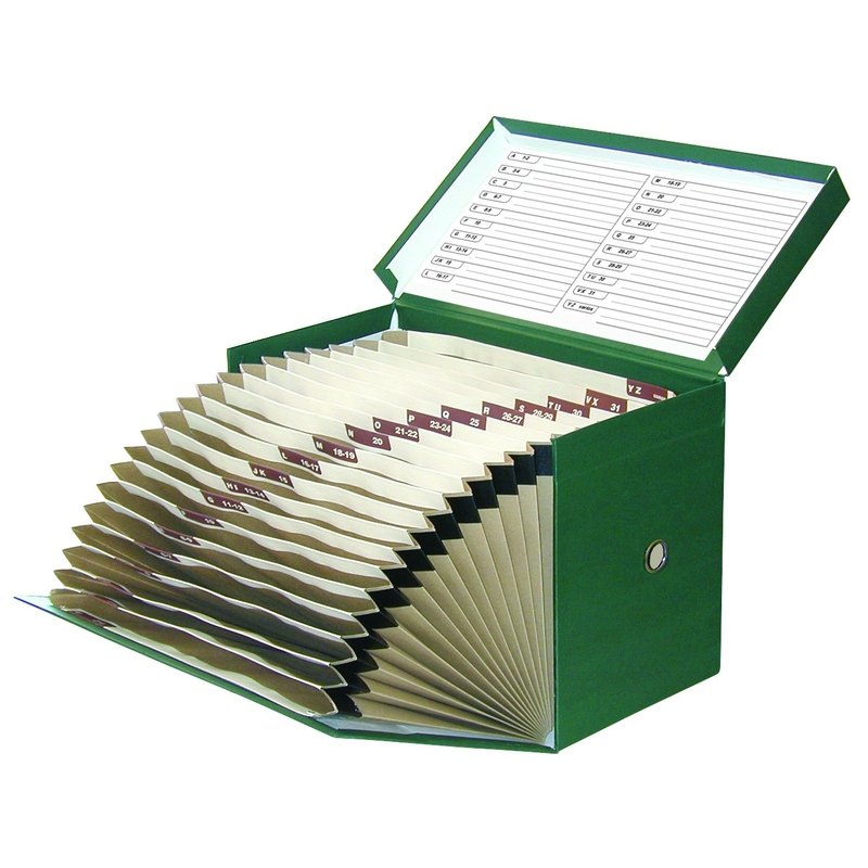 Cajas clasificadoras forradas con geltex, con índice en la tapa interior con separaciones rotuladas A-Z y 1-31. 20 separadores. Lomo 210mm. Dos agujeros reforzados en ambos laterales para facilitar su transporte. Dimensiones: 260x400mm.